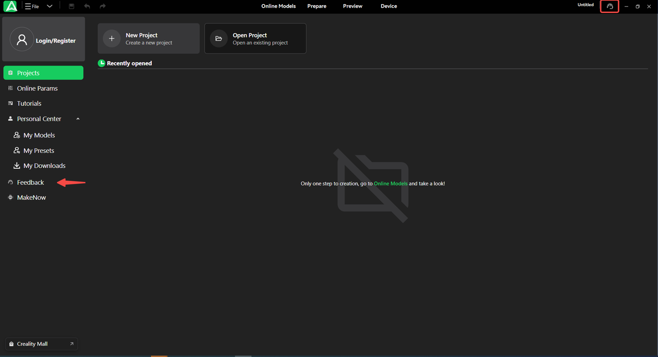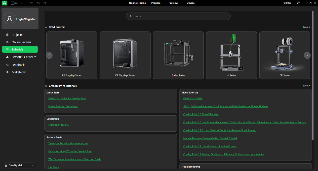 A new quick-access entry to the Creality Mall has been added to the homepage sidebar—allowing users to browse and purchase printers, filaments, and accessories directly from within Creality Print.