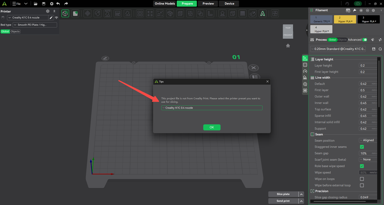 Optimized the import logic for third-party 3MF files. When importing 3MF files created for non-Creality printers, users are prompted to select a printer preset. Printer parameters from third-party 3MF files that are incompatible will not be imported. Modified process parameters and filament types/colors can be imported, while any unsupported filaments or process settings will be replaced with the default parameters matched to the selected printer preset.