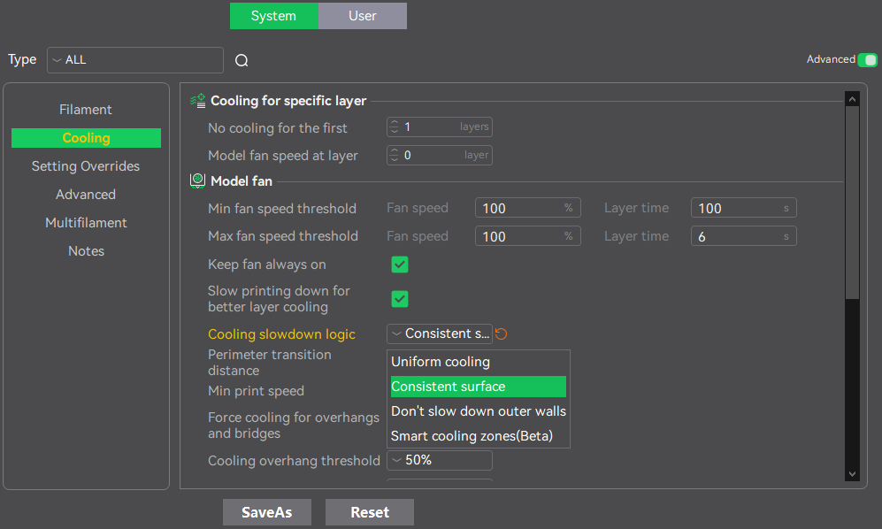 New Filament Parameter: Cooling → Cooling Slowdown Logic → Consistent Surface / Uniform Cooling