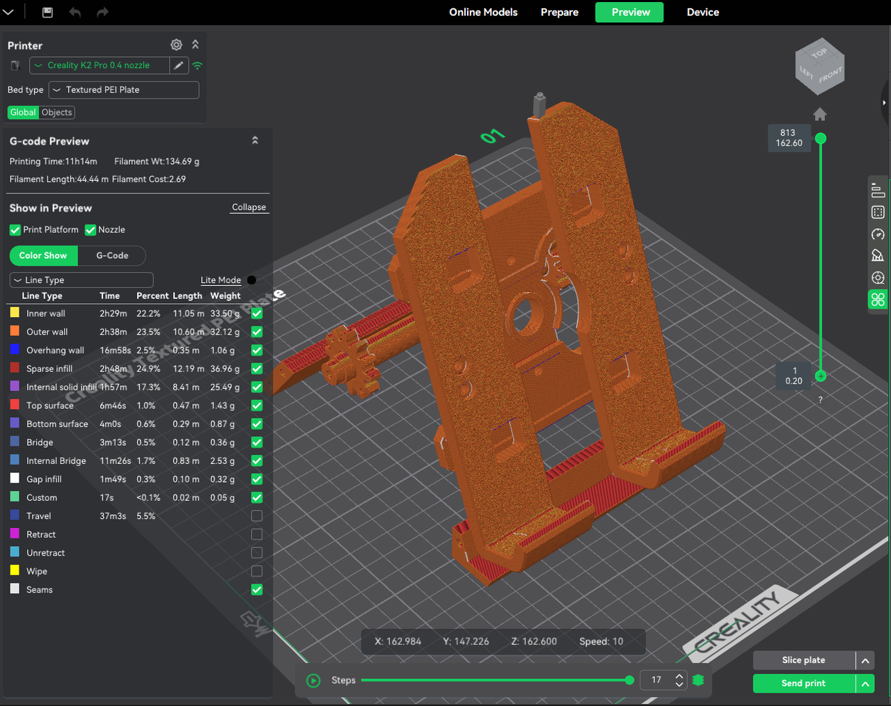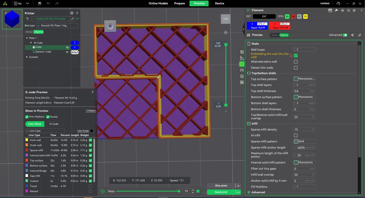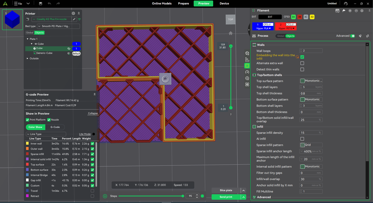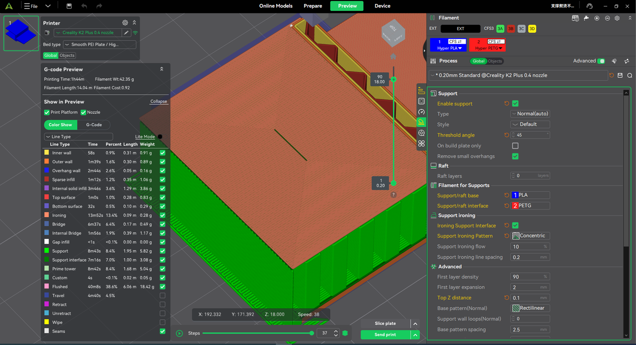 The preview interface now displays filament usage (length/weight) for each path type, enabling better cost estimation and parameter tuning.