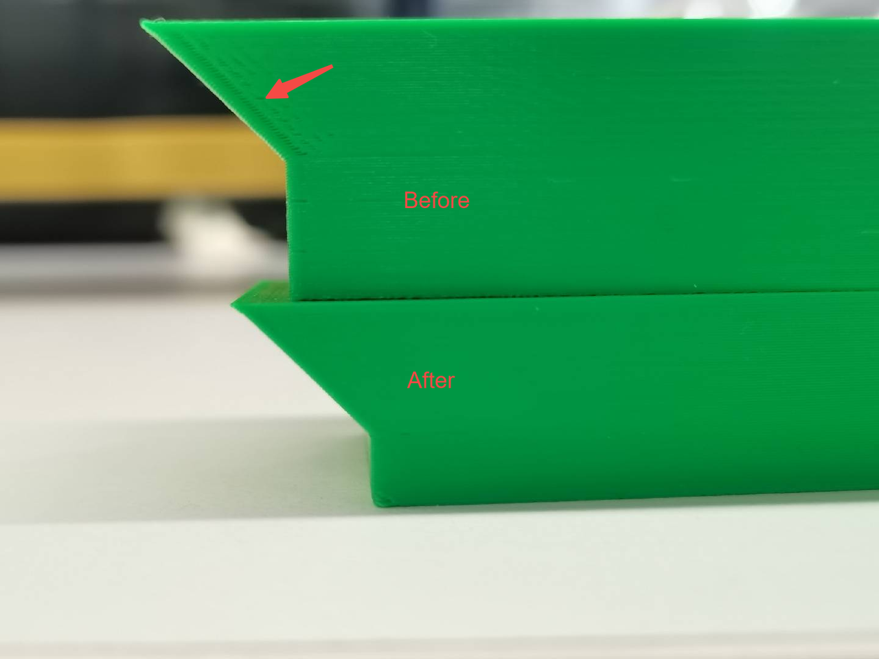 After overhang sections, a visible under-extrusion line often appears, which is a common issue in FDM printing. This occurs because overhang regions typically trigger the slicer’s overhang slowdown strategy, followed by a rapid recovery of speed and acceleration. However, there is a delay in the buildup of melt pressure in the hotend relative to the actual extrusion flow, causing a temporary material supply lag at transition areas and resulting in under-extrusion artifacts.