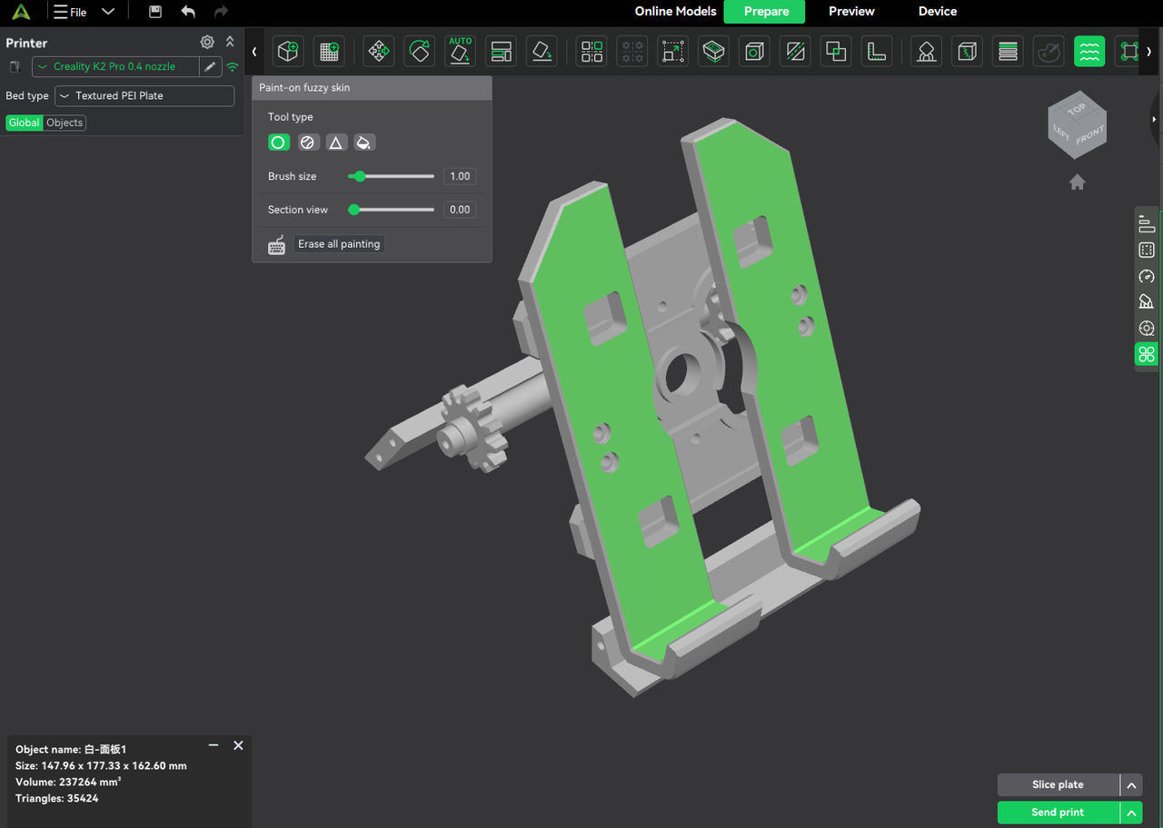 Supports freeform painting of fuzzy skin regions for localized texture control.