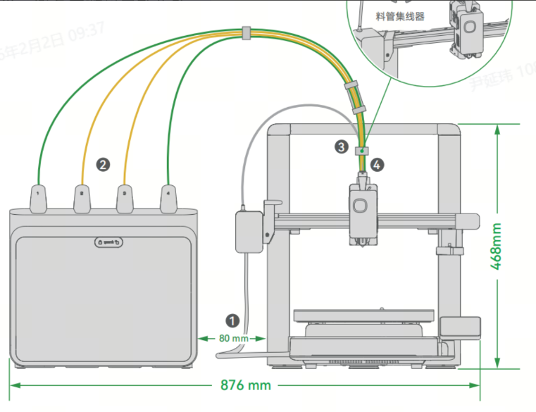 If the CFS lite is placed too far away, filament loading and unloading resistance will increase, and feeding resistance will also increase when printing on the right side of the build area.
