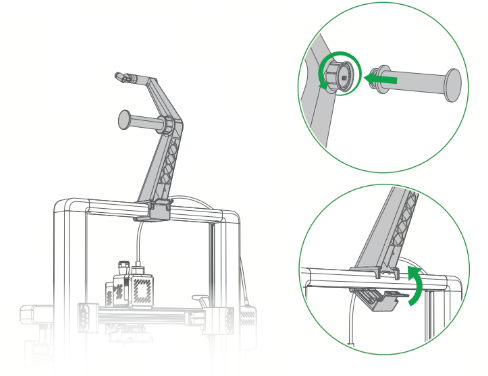 Assemble the i7 external Spool Holder and mount it onto the Gantry. Connect one end of the PTFE Tube to the Spool Holder Filament Inlet, and connect the other end to any filament inlet on the Toolhead Manifold. Please secure the Toolhead Cable and the PTFE Tube into the filament hub to prevent damage during operation.