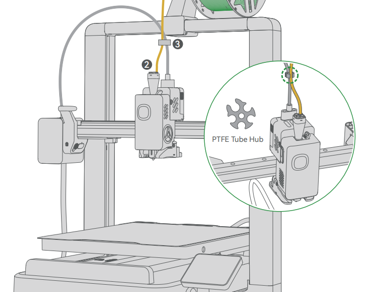 Insert the filament into the Filament Inlet on the spool holder according to the filament winding direction, and feed it through the PTFE Tube into the Toolhead until it cannot be pushed further.