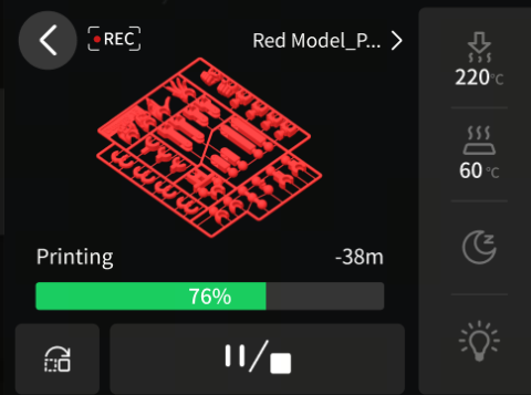 If the filament runs out during printing, the current print job will be automatically paused. Follow the steps in “Pre-print Preparation” to reload the filament, and printing can continue after the refill is complete.