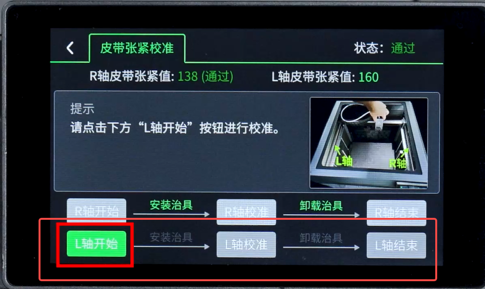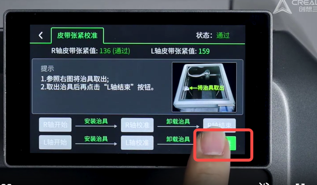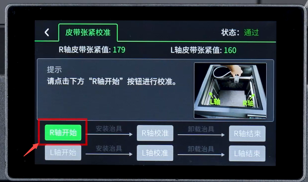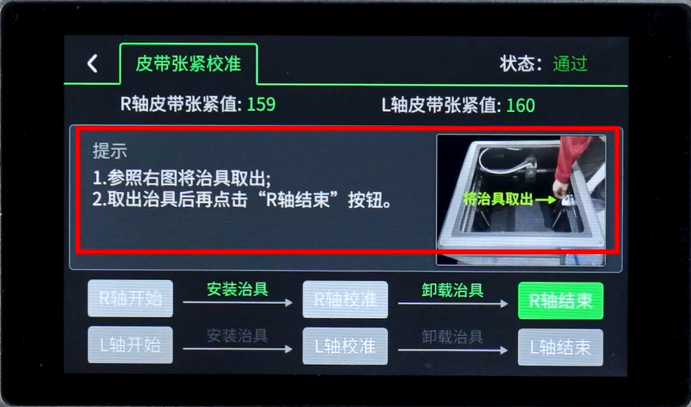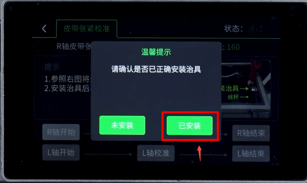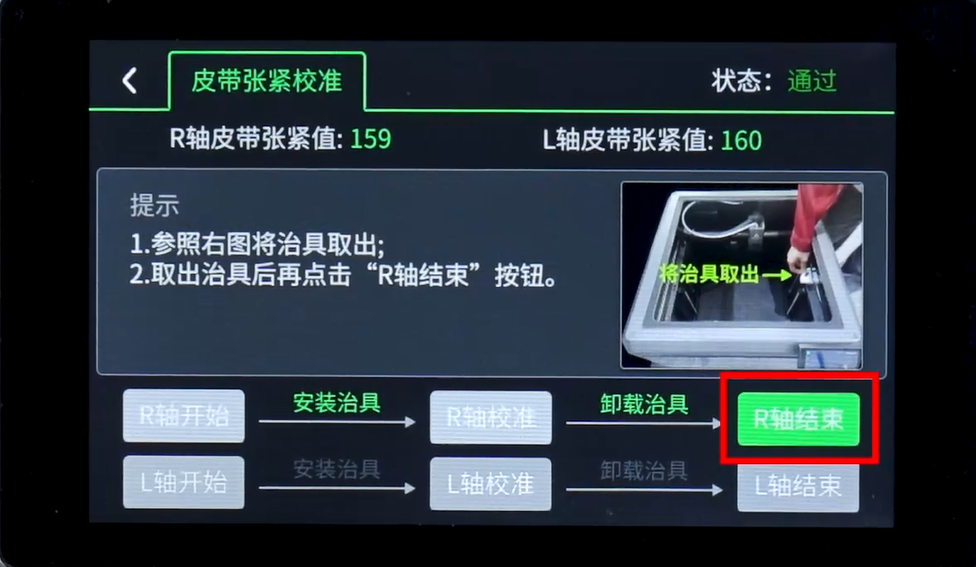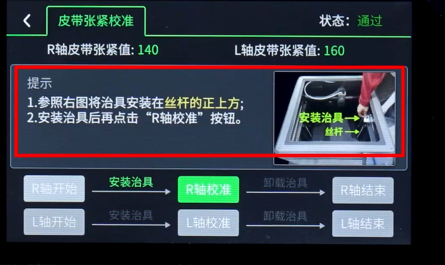 5. 按照提示,将打印好的治具卡在R轴皮带上(如图所示)。